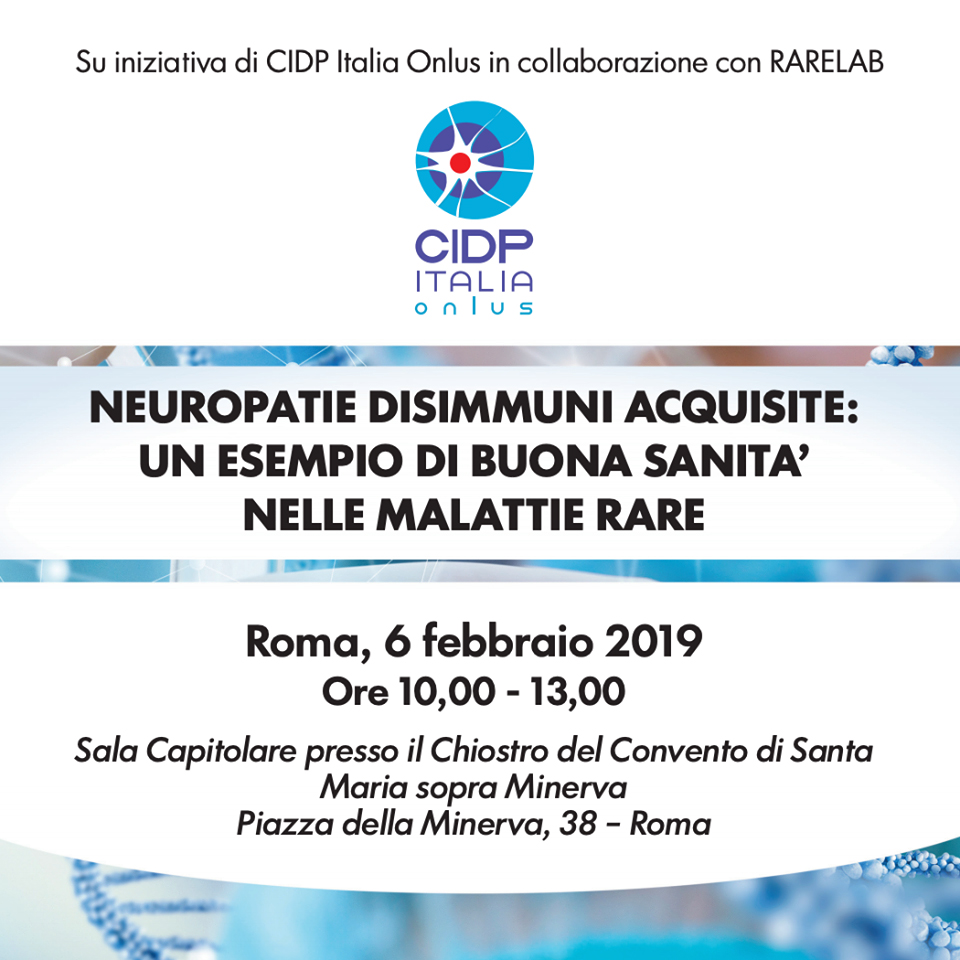 Si terrà a Roma, alla Sala Capitolare del Chiostro del Convento di Santa Maria sopra Minerva (Piazza della Minerva, 38) il 6 febbraio 2019 dalle 10 alle 13 il convegno “Neuropatie disimmuni acquisite: un esempio di buona sanità nelle malattie rare” organizzato su iniziativa dell’Associazione Italiana dei pazienti di Neuropatie Disimmuni CIDP Italia Onlus, in collaborazione con RARELAB.